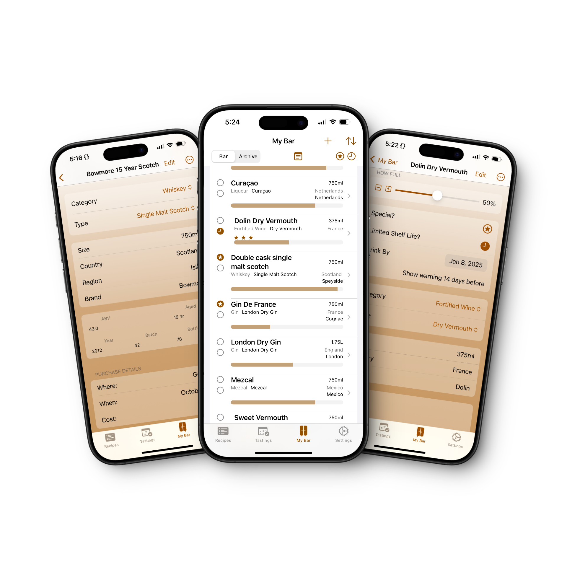 - Track each bottle in your bar—how much is left, where purchased, price paid, expiration date, and more